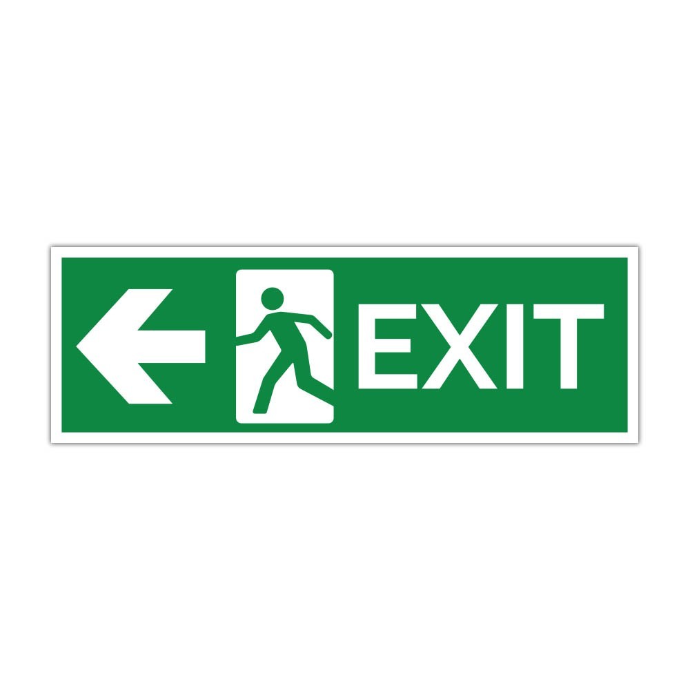 Indicator de evacuare cu text EXIT, pictogramă de ieșire și săgeată orientată spre stânga, ideal pentru marcarea clară a căilor de evacuare în spații comerciale, birouri, hale sau instituții.