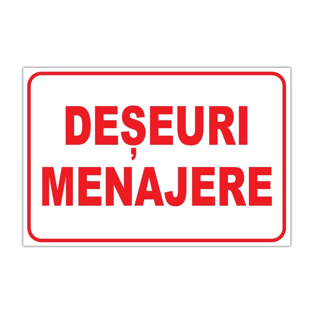 Indicator de informare „Deșeuri menajere”, ideal pentru marcarea clară a zonelor dedicate colectării gunoiului menajer. Disponibil pe autocolant printat UV sau pe plastic PVC 3 mm, în mai multe dimensiuni.