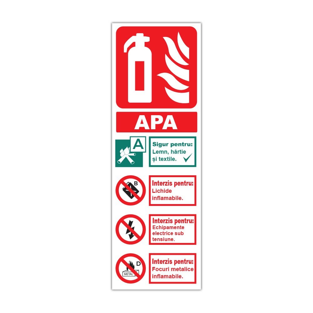 Indicator PSI pentru stingător cu apă, destinat semnalizării clare a tipului de stingător și a utilizărilor permise sau interzise. Disponibil în variante pe autocolant printat UV sau pe plastic PVC de 3 mm.