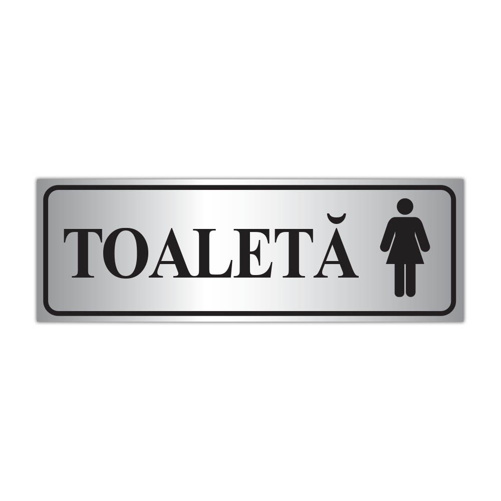 Indicator pentru grup sanitar femei, cu textul „TOALETĂ” și simbol feminin, ideal pentru semnalizare clară în spații comerciale, birouri, restaurante, pensiuni sau instituții. Disponibil în variantă autocolant printat UV sau plastic PVC 3 mm.