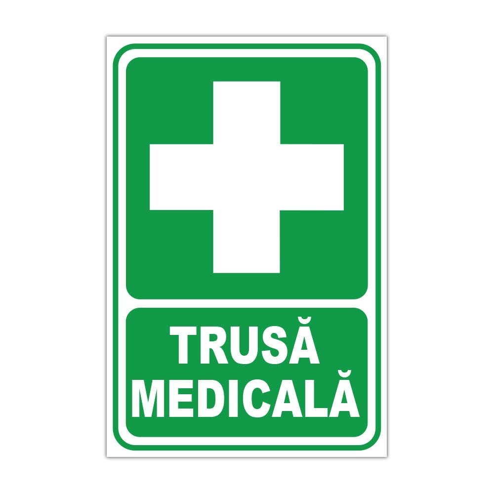 Indicator de informare „Trusă medicală”, cu simbol grafic cruce albă pe fundal verde, potrivit pentru marcarea vizibilă a trusei de prim ajutor în spații comerciale, birouri, depozite, instituții sau zone de lucru.