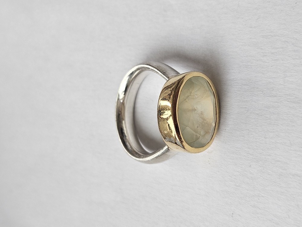 Inel din argint lucrat manual in Germania, marca Schmuck by Ute Wichels, piatra de Prehnit incastrata in argint placat cu aur, marimea 54, greutate 8.89 gr, marcaj 925 , in stare foarte buna, cumparati cu incredere, orice produs se poate returna! Transport doar prin Posta Romana!
