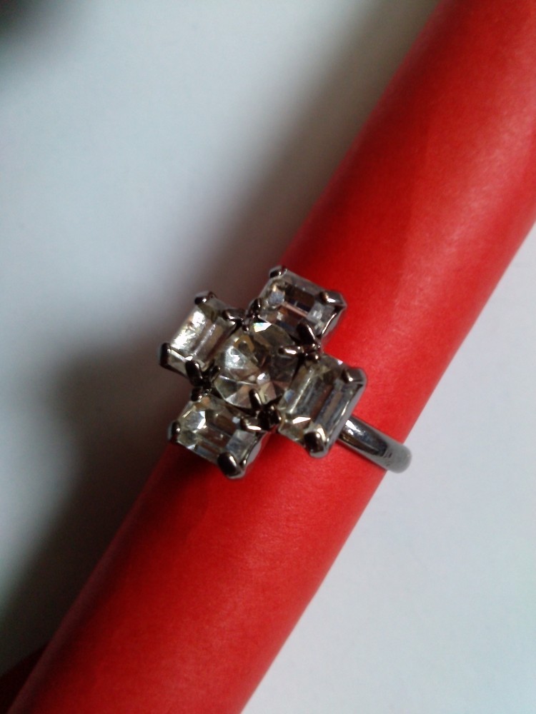 Inel din metal alb cu 5 pietre cristal, diametru ajustabil
