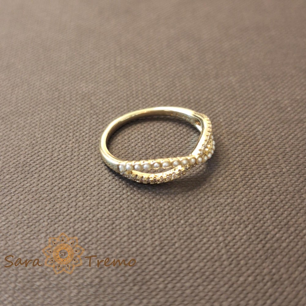 Inel dublu cu zirconia albe si perle eco - placat 14k