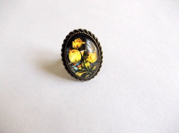 Inel lalele galbene, inel sticla femei 39238. Inel sticla, inel reglabil femei cu flori – lalele galbele. Dimensiuni 28 mm / 20 mm.
