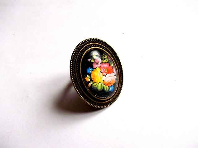 Inel cu flori viu colorate, inel reglabil femei 32401. Bijuterie cadou femei cu model floral – flori viu colorate pe fundal negru.