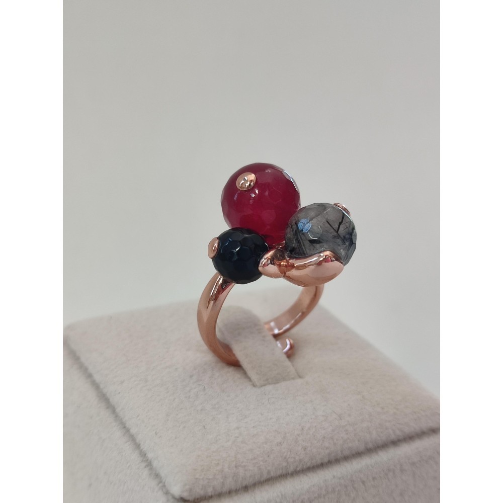 Inel Trilogy , reglabil, din agat rubiniu, agat negru și cuarț rutilat gri. Culorile pietrelor semiprețioase poti fi diferi în funcție de reflexia luminii. Sfere de 6, 8 si 10 mm. Detalii produs: Argint 925/°°° placat cu aur roz, cu tratament antioxidant unic. Certificat de garanție a materialului. Cutie și pungă cadou incluse. Fiecare bijuterie este realizată manual, cu precizia inconfundabilă Made in Italy. Notă: Culorile pietrelor semiprețioase pot diferi în funcție de reflexia luminii.