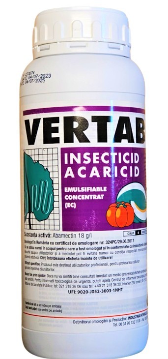 VERTAB contine abamectin 18 gr/l este formulat ca lichid transparent, de culoare galben-deschis,