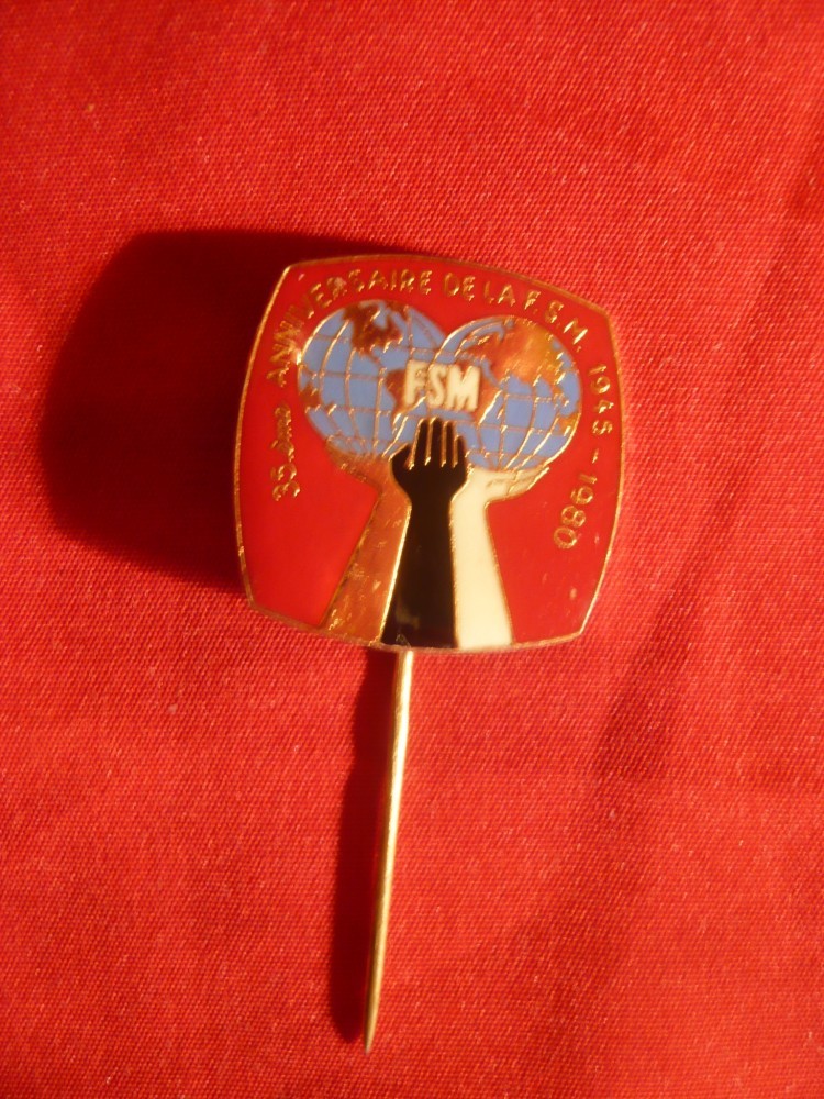 Insigna -A 35a Aniversare a FSM 1945-1980 , metal si email , L= 2,3 cm