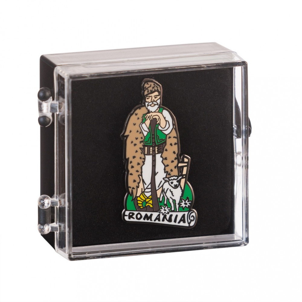 Insigna este realizata din metal, fata este vopsita in culori emailate, acoperite cu lac. Grafica ilustreaza un ciobanas, personaj caracteristic satului vechi, romanesc, alaturi de mioara sa.
