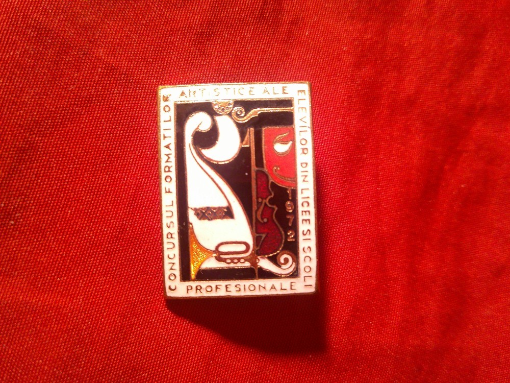 Insigna Concursul Formatiilor Artistice ale elevilor din Licee si Scoli Profesionale 1972 , metal si email , dim.=2,6x1,8cm *