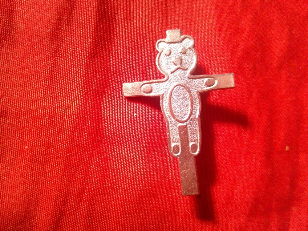 Insigna - Ursulet pe Cruce - Lupta impotriva exploatarii copiilor . metal h=3,6cm