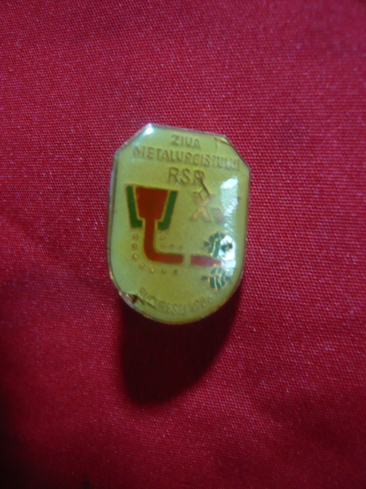 Insigna Ziua Metalurgistului RSR 1986 ,h=2cm , metal si email