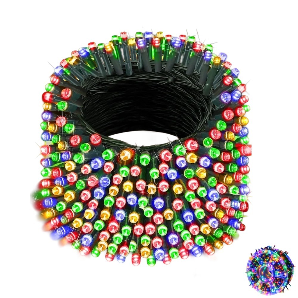 Instalatie de Craciun tip liniara IP44, 8 jocuri de lumini, 50 m, 500 Leduri, Multicolor, Interconectabila, Cablu silicon verde, Prelungitor de 3 m in