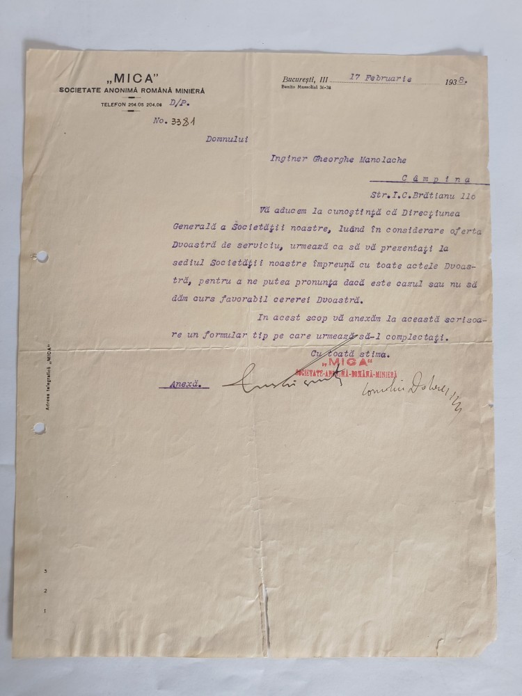 Instiintare, angajare emisa de S.A.R. Miniera MICA 1938 / CD1P
