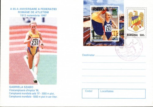 Intreg a 85-a aniversare federatiei Romane de atletism , Gabriela Szabo. Obliterat cu satmpila prima zi emisiunii Olymphilex Sydney -2000 la 07. 09 .2000. Stare buna .