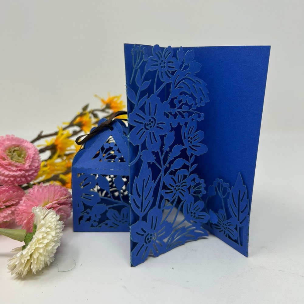 Impresioneaza-ti invitatii inca din prima clipa cu aceste invitatii si marturii de nunta, realizate din carton de calitate superioara, cu un design floral decupat fin. Culoarea albastru regal si detaliile elegante adauga rafinament, transformand fiecare piesa intr-o mica opera de arta. Setul este ideal pentru nunti, botezuri sau alte evenimente speciale, combinand frumusetea estetica cu utilitatea practica. Marturiile pot fi umplute cu bomboane, mici cadouri sau suveniruri, iar invitatiile transmit din start eleganta evenimentului tau.