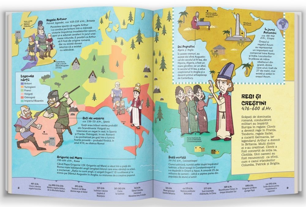 Faptele istorice sunt prezentate cronologic, pe harti ilustrate, astfel încât copiii sa înteleaga ce se întâmpla în lume în aceeasi perioada de timp.