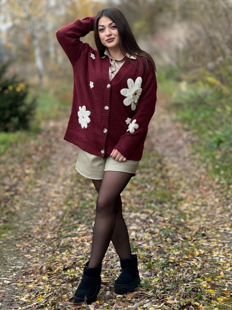 Jacheta dama bordo cu aplicatii flori crosetate