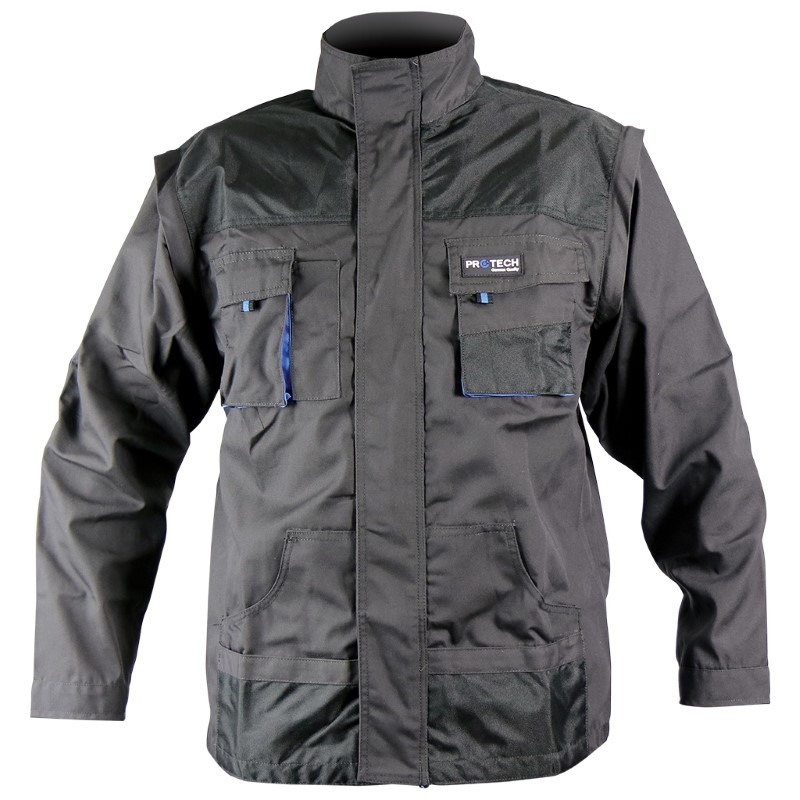jacheta 2 in 1. Material 65% poliester, 35% bumbac. Grosimea materialului: 267g/m2. Cusături triple x3. Întăriri în locuri cheie (pe coate). Buzunare detasabile (x7). Geaca de lucru MEISTER are o optiune suplimentara de scoatere a manecilor, deci poate fi folosita si ca vesta vara. Are certificat CE, EN340