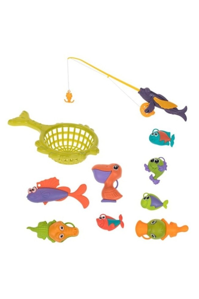 Set de pescuit cu undiță, pești de diferite dimensiuni, crocodil și pelican. Încercați să treceți momeala prin inelul peștelui pentru a-l prinde cu plasa! Pachetul include o undiță cu momeală galbenă, o plasă și 8 pești. ATENȚIE! Pericol de sufocare. Nu este recomandat copiilor sub 3 ani, conține piese mici care pot fi înghițite. Vârstă recomandată: 3+ ani.