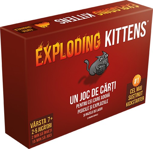 Un joc exploziv de petrecere. Exploding Kittens este un joc plin de putere pisiceasca, o varianta a ruletei rusesti. Jucatorii trag carti pe rand pana cand unul dintre ei trage o pisica exploziva si pierde jocul. In joc vei gasi carti care te lasa sa te uiti la alte carti sau cu care poti obliga un oponent sa traga mai multe carti. Combinand doua pachete poate fi jucat de pana la 9 jucatori.