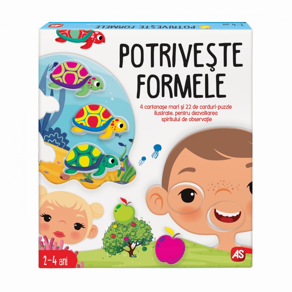 Potriveste formele este un joc format din 4 tablouri de bord mari si 22 de carti ilustrate. Fiecare tablou este format din 5 adancituri care potrivesc 5 carti cu obiecte de aceeasi forma. Copiii pot incepe sa joace pur si simplu observand imaginile de pe cartonase si plasandu-le pe tabloul de bord acolo unde se potrivesc. Pe masura ce se familiarizeaza cu jocul, se pot distra cu prietenii si familia lor jucand un joc de Bingo.
