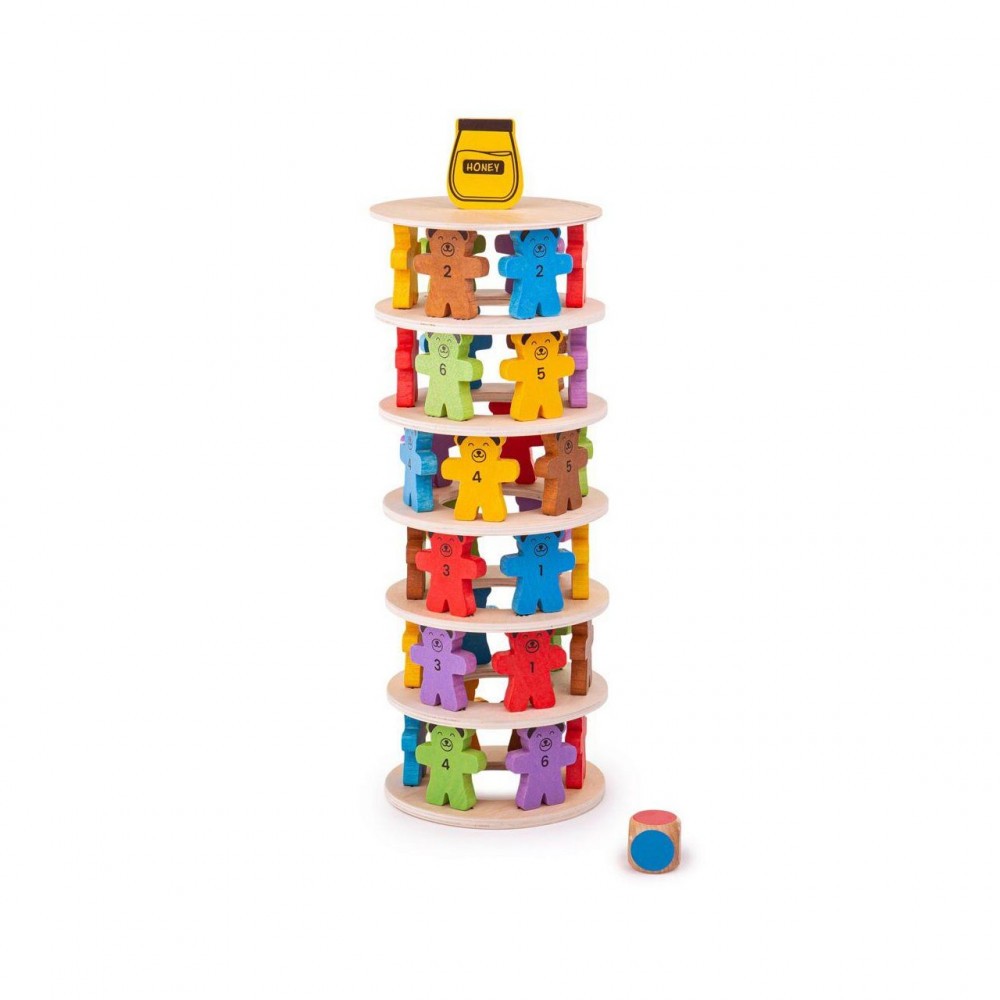 Care va fi primul care va ajunge la borcanul cu miere? Construieste cu ajutorul ursuletilor un turn colorat prin asezarea acestora corespunzator pe inelele din lemn. Rostogoleste zarul pentru a descoperi culoarea si retrage ursuletii unul cate unul pana cand se va darama borcanul cu miere.