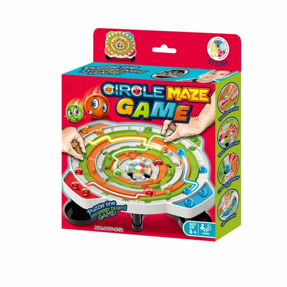 - Pe o tabla de joc rotativa formata din cercuri colorate (alb, verde, portocaliu), jucatorii isi propun sa-si duca bilele la campul final