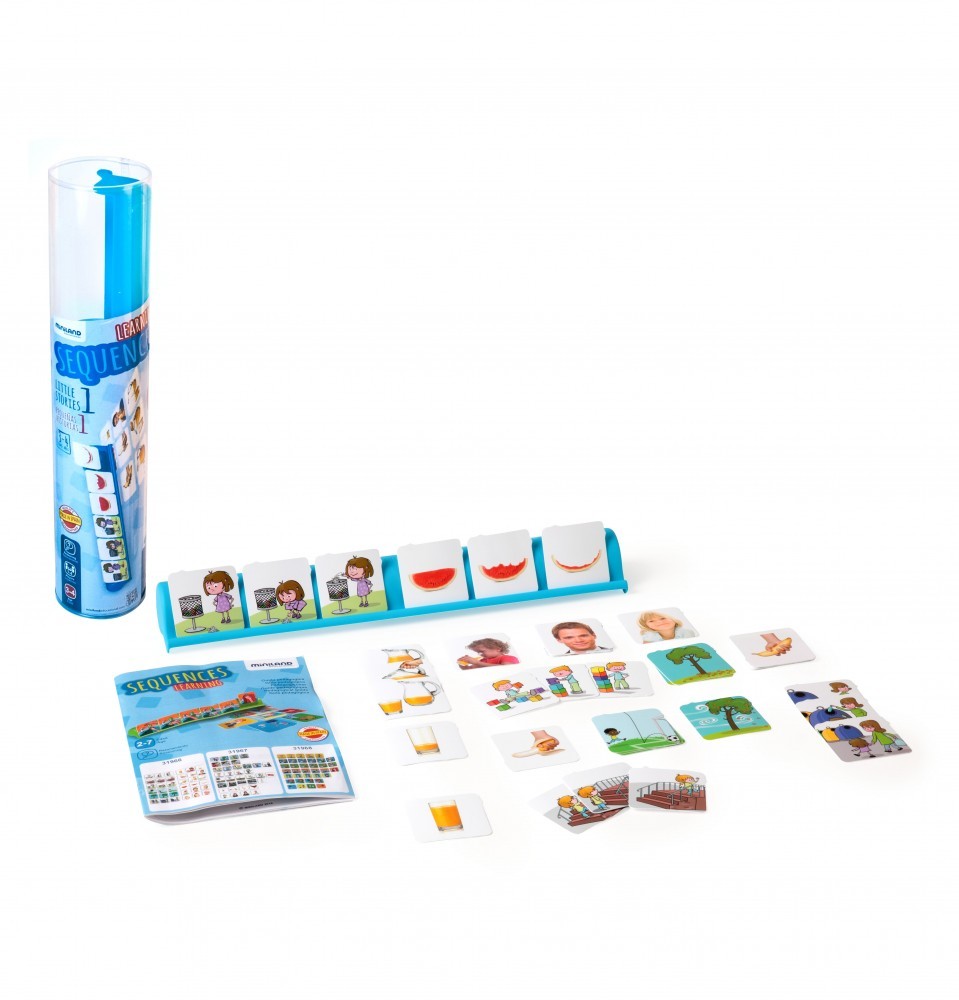Joc Secvente temporale - ordinea lucrurilor. Pentru 3-4 ani - Miniland Setul include: - 36 de carduri din plastic rezistent, incasabil, flexibil si lavabil, - 1 rama din plastic in care se introduc cardurile, - instructiuni. Jocul ajuta la intelegerea conceptului de timp (inainte/dupa), dezvoltarea vocabularului, exersarea abilitatilor de logica, cunoasterea mediului inconjurator. Dimensiune baza: 36*4.5*5.5 cm Dimensiune cardurilor: 5x 5 cm.