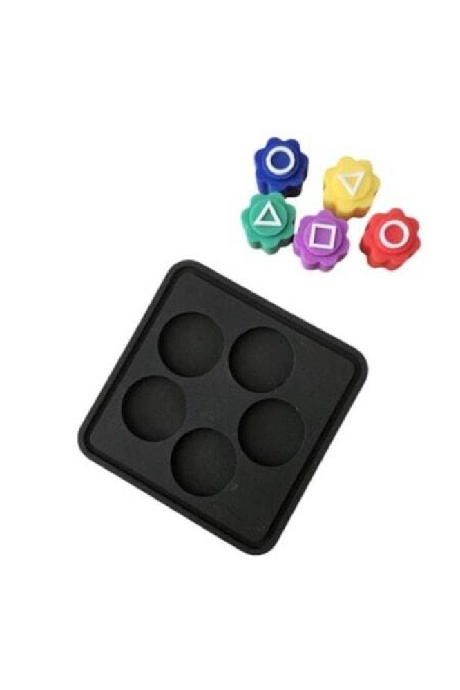 Jocul tradițional coreean Gonggi, Jocul Calamarului, include 5 piese multicolore și o tablă neagră.