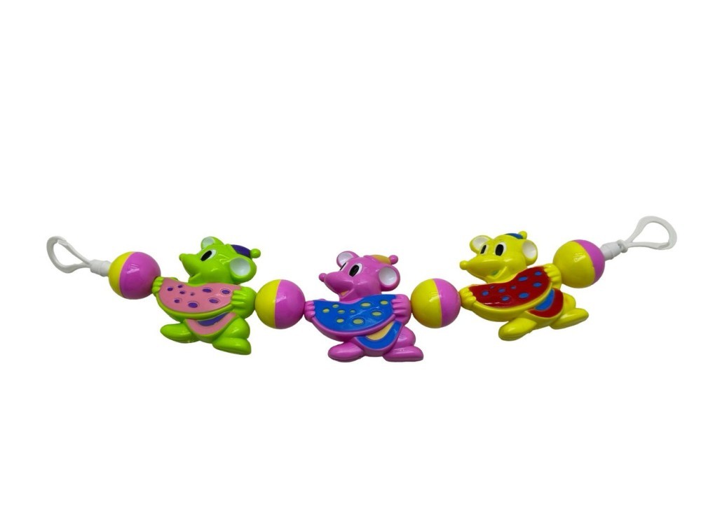 Jucarie carucior tip lant cu soricei colorati Descriere:Jucaria de carucior in forma de lant cu soricei colorati este ideala pentru a stimula simturile bebelusilor. Se prinde usor pe carucior sau patut, fiind realizata din plastic rezistent si viu colorat. Miscarea si culorile atrag atentia copilului si contribuie la dezvoltarea vizuala si motorie. Potrivita pentru bebelusi 0+ luni.Usor de prins pe carucior sau patut.Material sigur, non-toxic.Design jucaus cu 3 soricei si bilute colorate.