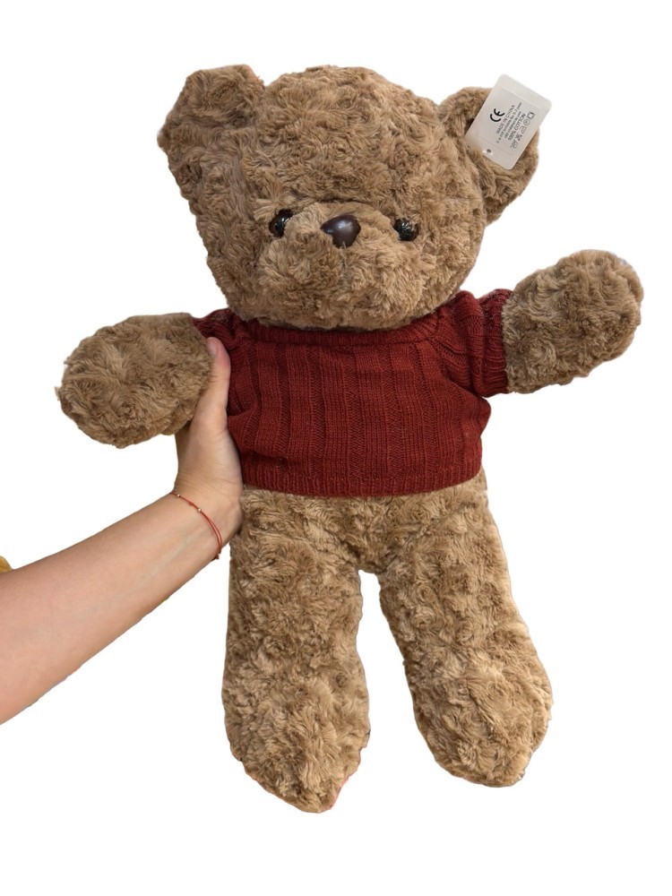 Jucarie de plus ursulet clasic maro cu hanorac rosu. Este umplut cu puf siliconat antislergic iar blanita are o textura foarte pufoasa. Se poate curata prin stergere cu o carpa umeda prin stergere. Dimensiune 50cm