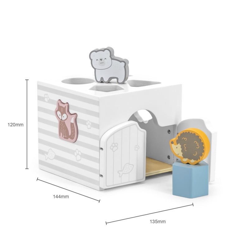 Setul include blocuri in 7 forme diferite (3 cu forme geometrice de baza cu diferite sunete, 1 cu oglinda si 3 in forma unor animale simpatice). Copiii pot potrivi diverse blocuri geometrice in deschizaturile potrivite, pentru ca apoi sa le scoata prin usile din spate. Jucaria incurajeaza recunoasterea formelor si coordonarea mana-ochi prin potrivirea blocurilor de diferite forme (triunghi, pentagon, patrat, cerc) in locurile potrivite. Diferitele sunete produse de blocurile din lemn ii vor ajuta pe cei mici sa isi dezvolte partea senzoriala. Jucarie educativa din lemn, Montessori. Varsta recomandata: 18 luni+. Dimensiuni: 13,5 cm x 14,5 cm x 12 cm. *AVERTISMENT! Contraindicat copiilor mai mici de 18 luni. Jucaria/produsul poate contine piese mici care se pot inghiti sau inhala existand pericolul de sufocare sau nu este potrivita copiilor mai mici de 18 luni. Toate jucariile marca VIGA sunt fabricate din lemn de calitate cu vopsele si cerneluri non-toxice, supuse testelor de siguranta respectand standardele pentru jucarii ale Uniunii Europene EN71 si ASTM. Nu lasati ambalajul produsului la indemana copiilor. Indepartati orice ambalaj al produsului inainte de a da jucaria copilului. Va recomandam sa supravegheati copilul in timp ce se foloseste produsul. Pastrati instructiunile si etichetele pentru referinte viitoare. Feriti produsul de foc, temperaturi ridicate si umiditate.