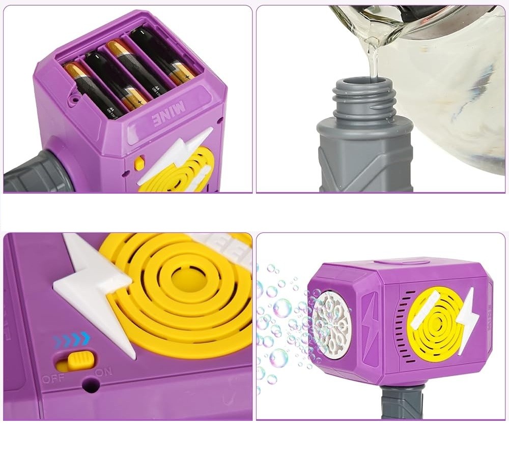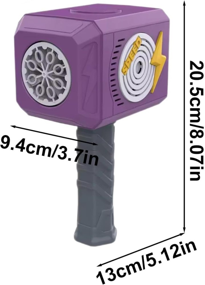 Jucarie Interactiva pentru Baloane de Sapun, Cyrax, Sunete si Lumini, Model Ciocan, cu 8 Orificii, 13.5 x 10 x 12 cm, Mov