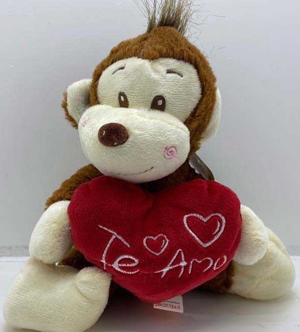 Jucarie Maimuta cu inima de plus. Inaltime 23 cm. Material plus. Este recomandat copiilor peste 3 ani.