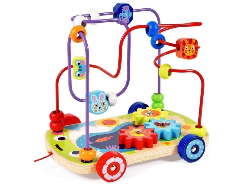 Jucarie motrica de tras circuit cu bile tip labirint Montessori cu roti si mecanism cu roti zimtate.