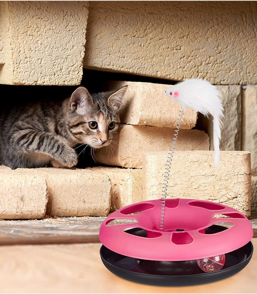 Indiferent daca aveti un pisoi tandru sau un motan dur: Fiecare pisica are un instinct de vanatoare latent care asteapta doar ocazia potrivita. Datorita jucariei pentru pisici, el poate in sfarsit sa faca putin miscare. O minge se rostogoleste prin pista, in interiorul careia se afla un clopot, al carui sunet anima pisoiul casei sa se joace. Datorita deschiderii, pisica poate sa urmareasca mingea. Un soricel alb de plus este atasat arcului oscilant, care rotunjeste accesoriile de joaca pentru pisici.