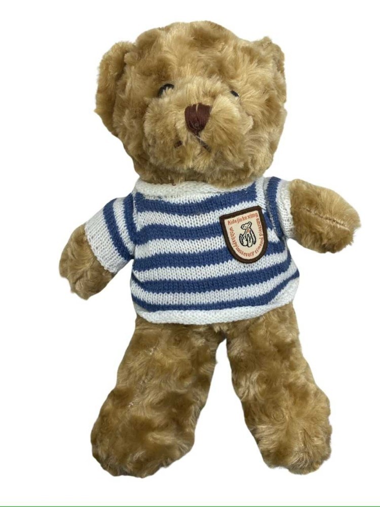 Jucarie plus ursulet maro cu pulover alb albastru cu inaltimea de 30 cm. Se curata prin spalare sau stergere cu o carpa umeda. Recomandat copiilor cu varsta peste 3 ani