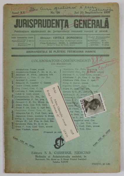 JURISPRUDENTA GENERALA , PUBLICATIUNE SAPTAMANALA DE JURISPRUDENTA ...ANUL XV , NR. 28 , JOI 23 SEPTEMBRIE , 1937