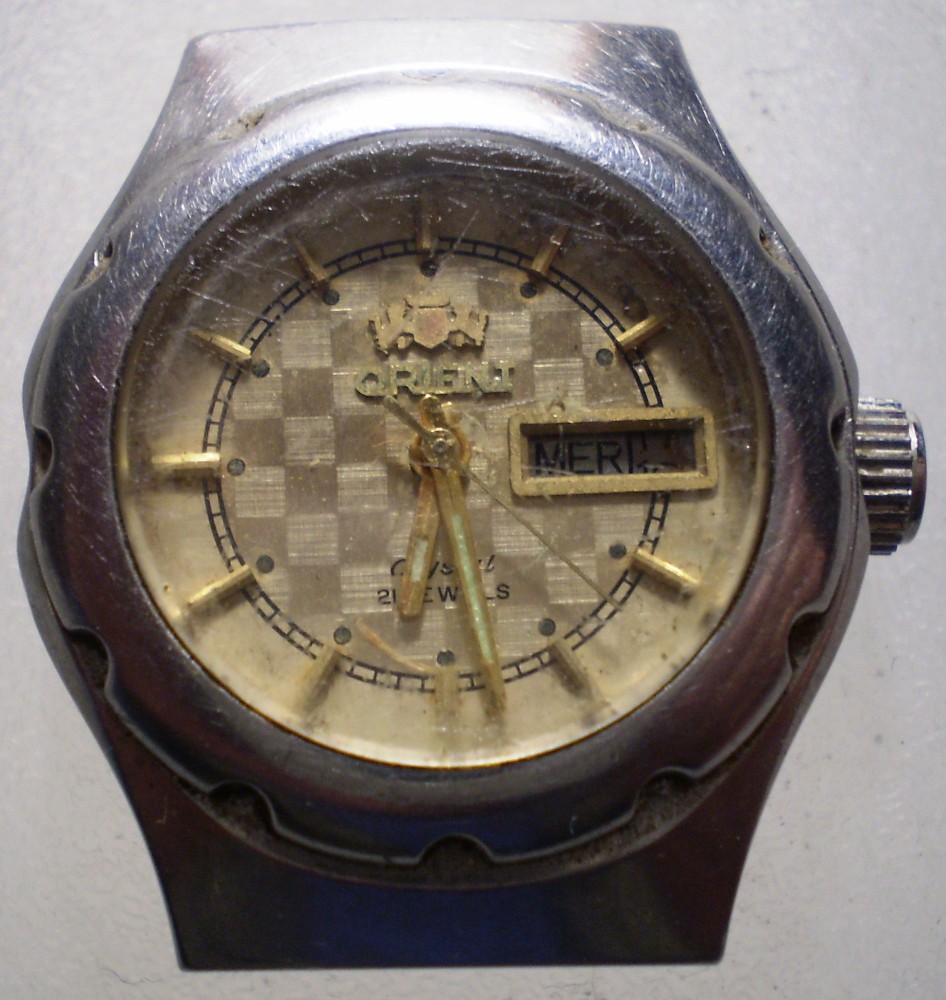 Pentru piese de schimb. Balansierul e defect. Mecanismul nu a fost demontat pentru a verifica dacă are toate piesele. Dimensiunile ceasului (fără anse și coronita) 30/25mm. Cheita actioneaza usor acele indicatoare iar în prima poziție schimba ușor zilele săptămânii dar nu actioneaza zilele lunii. Carcasa si capacul sunt din inox și arata conform foto. Geamul are mai multe evidente zgarieturi iar cadranul e ușor murdar/oxidat (vezi foto). Ceasul are urme de uzura si arata exact ca în foto.