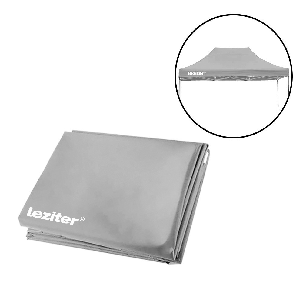 Prelata foișorului Leziter de 3x4,5 metri este fabricată din material Oxford 420D, care este hidrofug și rezistent la UV datorită stratului de PVC. Logo-ul Leziter plasat pe toate cele patru laturi oferă un aspect sofisticat oricărui eveniment. Culoarea gri este elegantă și se armonizează cu stilul grădinii tale. Această prelată este ușor de înlocuit, astfel încât să vă puteți reînnoi acoperișul foișorului în câteva secunde, chiar și înainte de o invitație neașteptată sau un eveniment planificat.