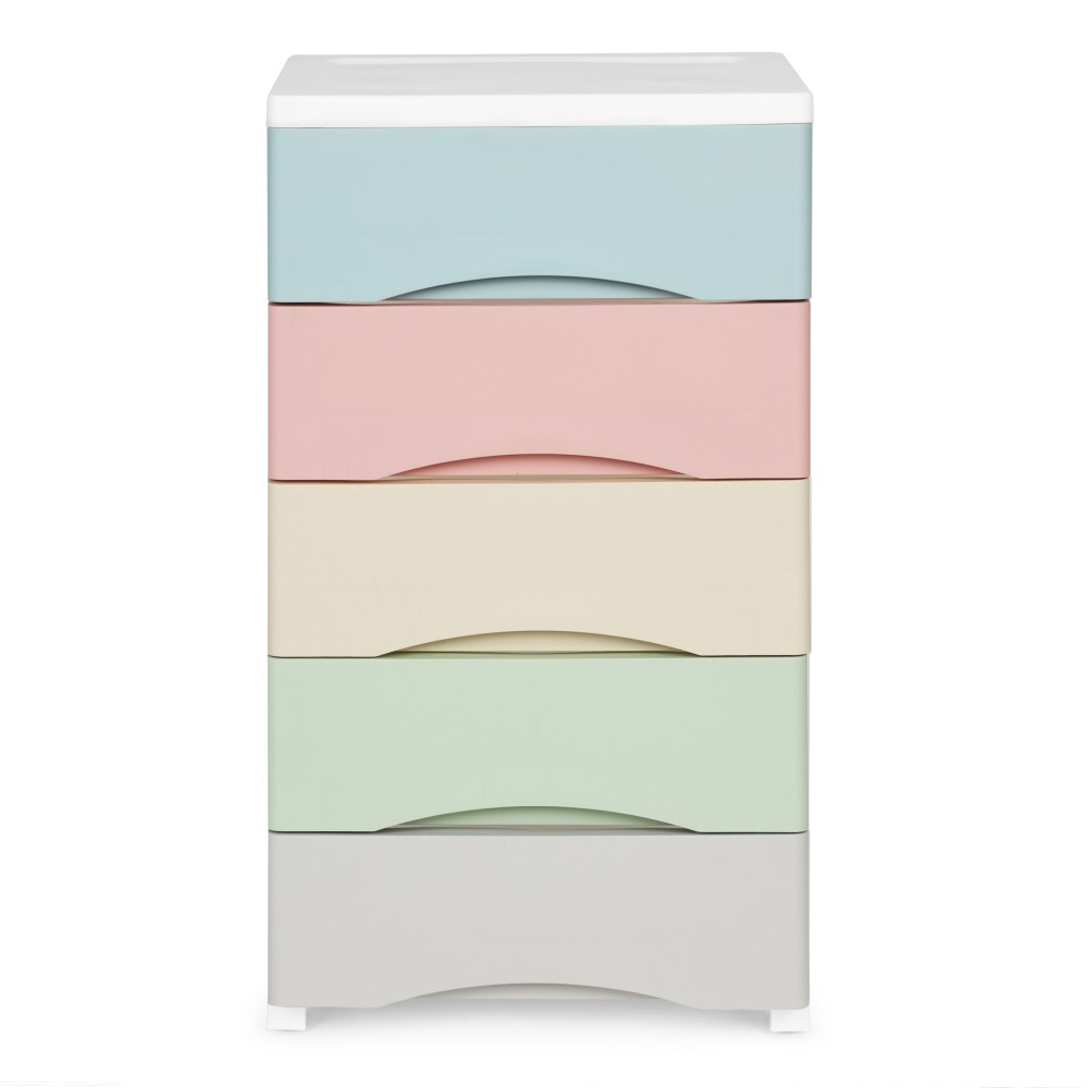 Raftul este format din cinci sertare colorate, cu mânere special concepute în față, ceea ce face ușoară glisarea lor înăuntru și în afară.