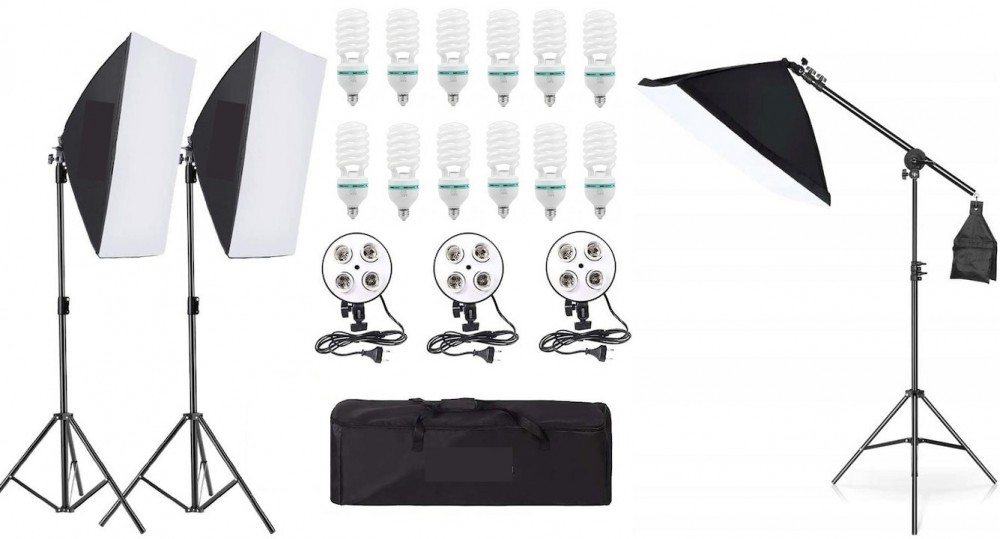 Pachetul include (3)x 50x70cm Softbox; (3)x 2m suport de lumină; (3)x fasung suport pentru 4 becuri; (12)x bec foto de 85W; (1)x macara cu brat extensibil; (1)x geanta de transport