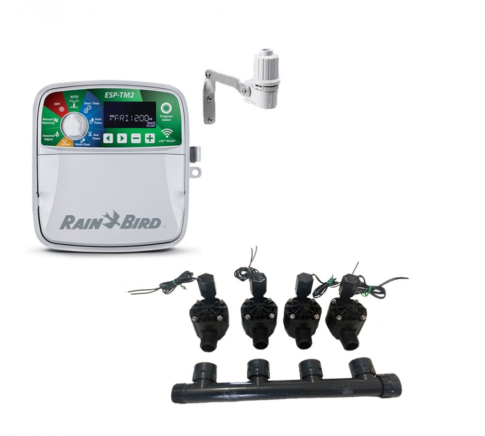 Pachetul contine : Programator – Controler ESP-TM2 4 Zone exterior Rain Bird, 4 Electrovane HV 100 FE 1ʺ Rain Bird 24 V, Distribuitor 4 ieșiri (manifold), Senzor de ploaie RSD-BEX Rain Bird