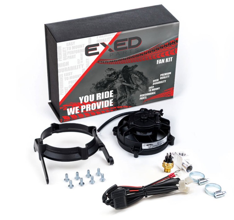 Original SPAL Radiator Cooling Fan and Mounting Kit for KTM and HUSQVARNA with Thermoswitch, Dirt Bike Models from 2017 to 2023, 2+4 Stroke TECHNICAL DATA: – fan model that can be mounted in front of the cooler. – mounting diameter: 109mm – wing diameter: 96cm – mounting depth: 48mm – voltage: 12V – power input: 1,9A – air quantity: 210 m³/h – weight: 0,4 kg PACKAGE INCLUDES: – 1 x Fan/Ventilator – 1 x Radiator Mounting Bracket – high grade plastic – 1 x Thermoswitch Temperature Sensor, aluminium seal ring 100°-93°C – 1 x Thermoswitch Cable – 1 x Aluminium T – 1 x Fan wiring harness – 8 x Screws – 2 x Blind rivets – 1 x Installation Instructions