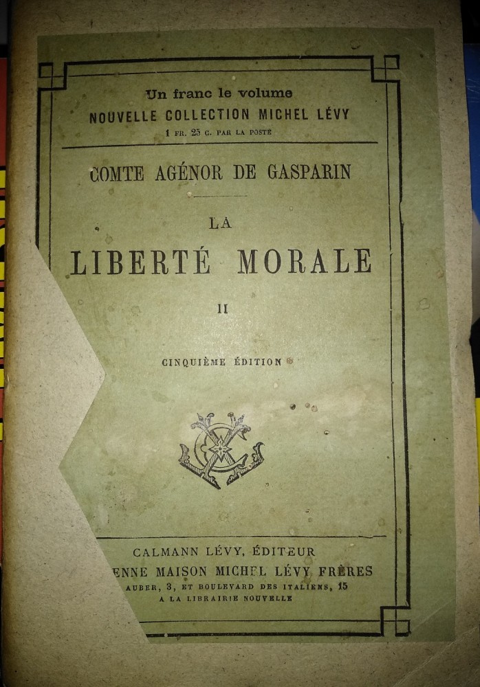 La Liberte Morale II, de Comte Agenor de Gasparin, editura Calmann Levy, Paris, 1879, 536 pagini. Stare bună. Text în limba franceză. Pentru București fac predare personală. Pentru alte localități 11 ron taxe postale cu ramburs sau 6 ron colet simplu cu plata prin virament bancar. Pentru produse comandate în valoare de 50 ron trimit gratis colet simplu sau 5 ron cu ramburs, iar la 100 ron comanda expediez gratis cu ramburs.
