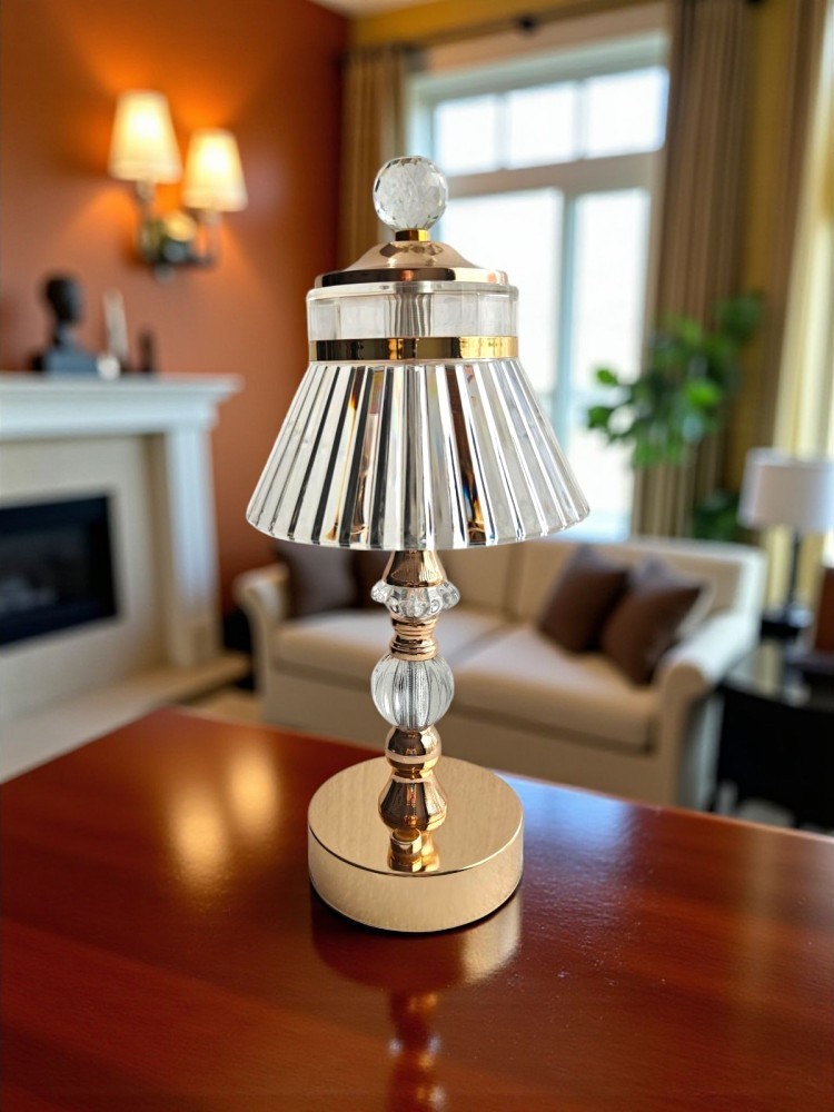 - Cu finisaj auriu elegant și abajur texturat, această veioză emană stil și bun gust. Elementele decorative tip cristal de pe suport adaugă un plus de eleganță. Construcția solidă asigură stabilitate pe orice suprafață plană.