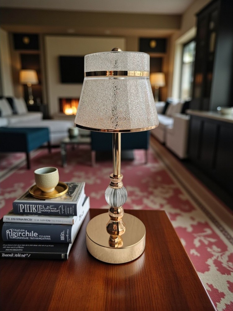 - Cu finisaj auriu elegant și abajur texturat, această veioză emană stil și bun gust. Elementele decorative tip cristal de pe suport adaugă un plus de eleganță. Construcția solidă asigură stabilitate pe orice suprafață plană.