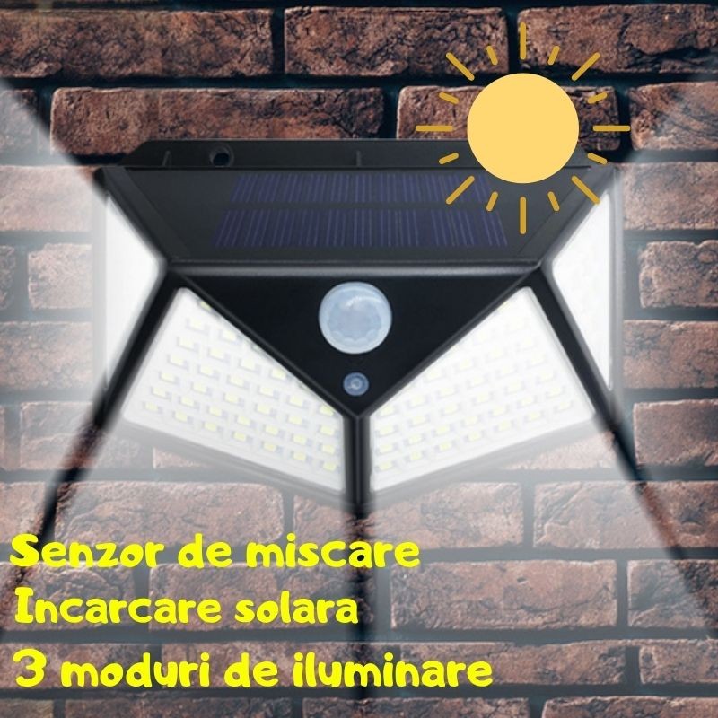 Lampa 100 LED cu panou solar, senzor de miscare, 3 moduri de iluminare